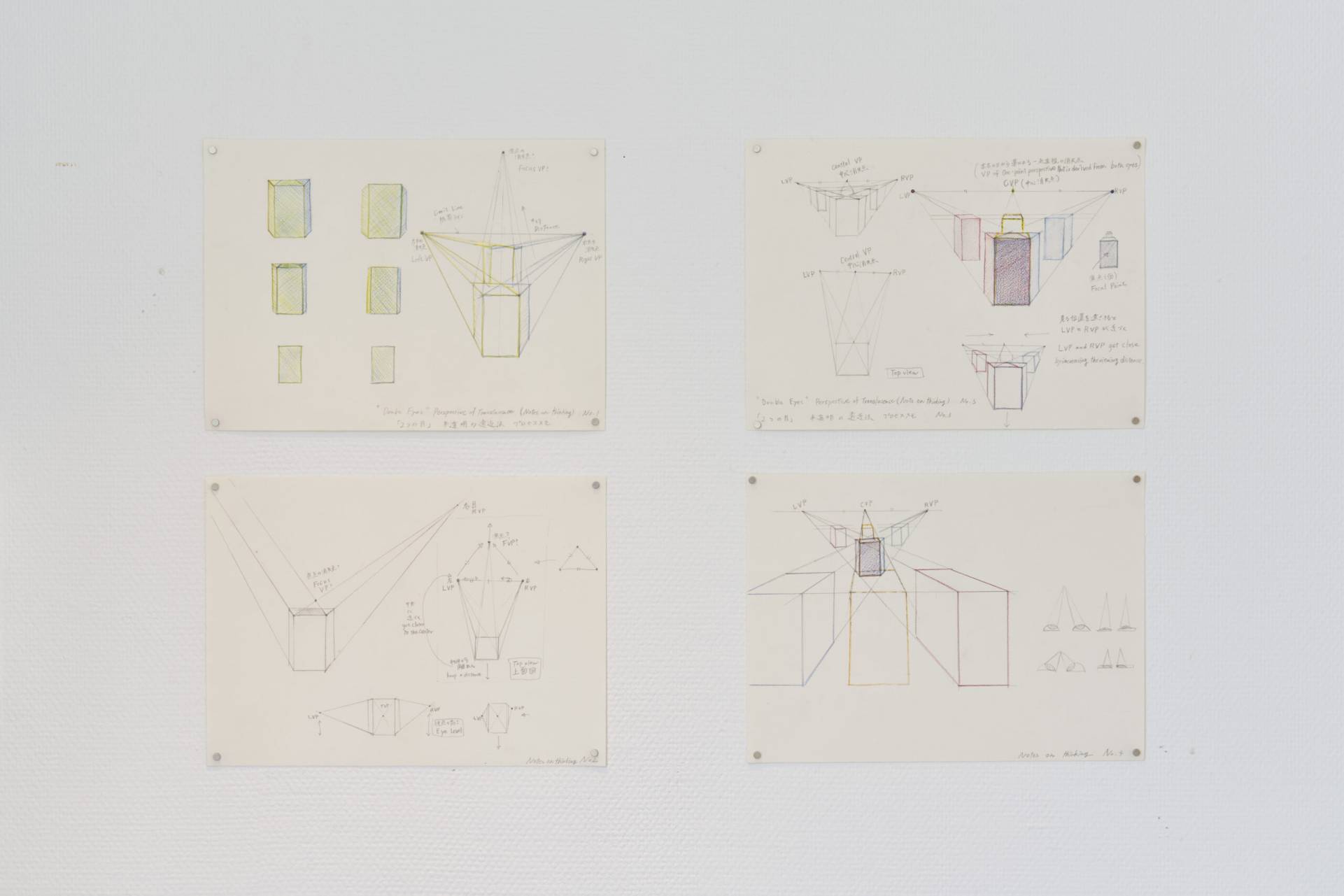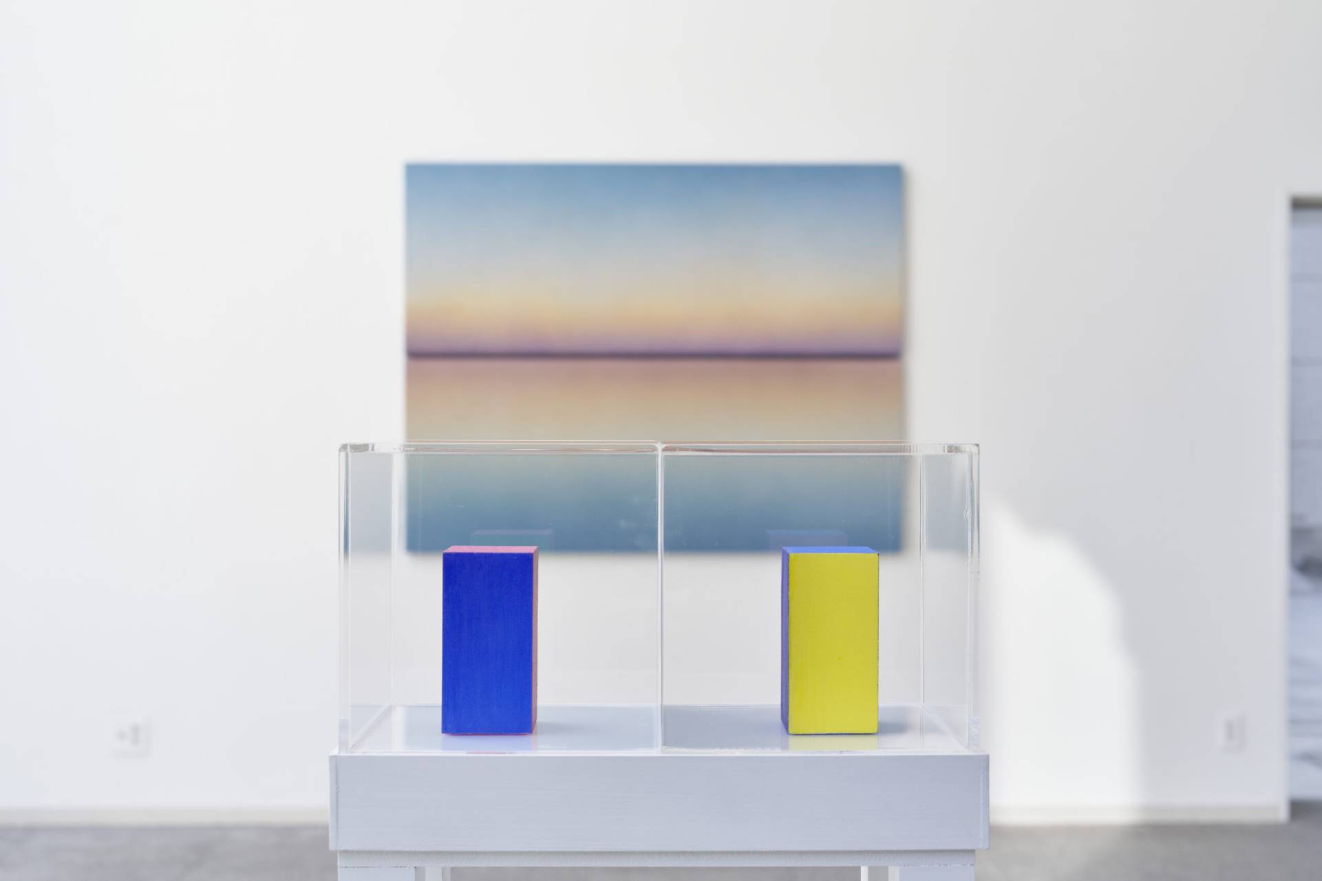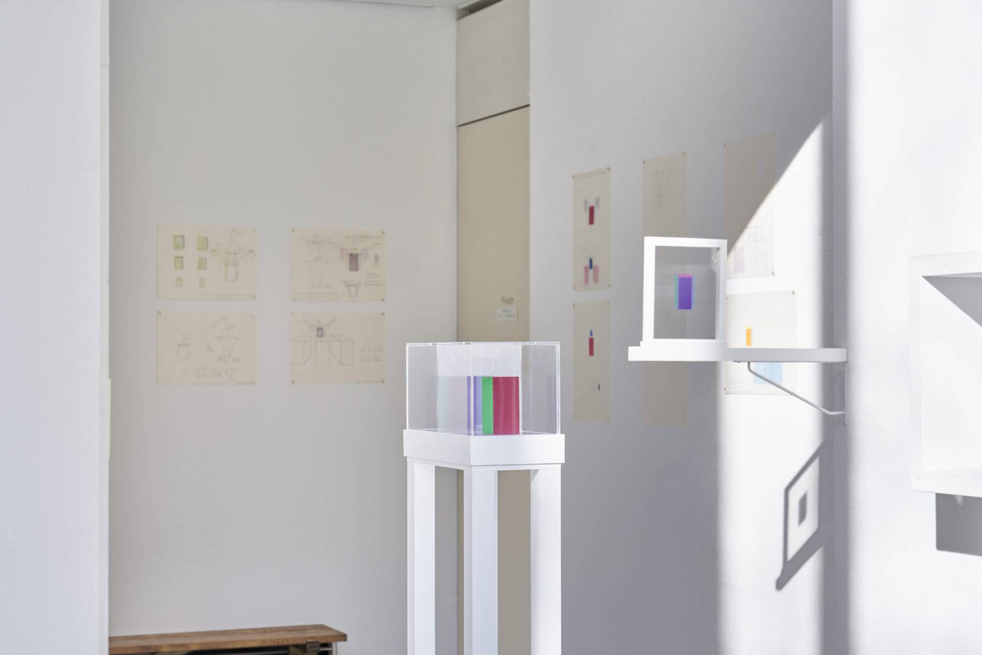 The word mizukage (written 水影) is an archaic Japanese term that encompasses two kinds of reflection produced by water: mirrored images and reflected glare—what Kawamoto refers to as “double reflection.” In researching this word, she discovered an alternative reading, suiei, which refers to “road mirage”: a phenomenon in which what appears to be a pool of water in the distance recedes further away as one approaches.