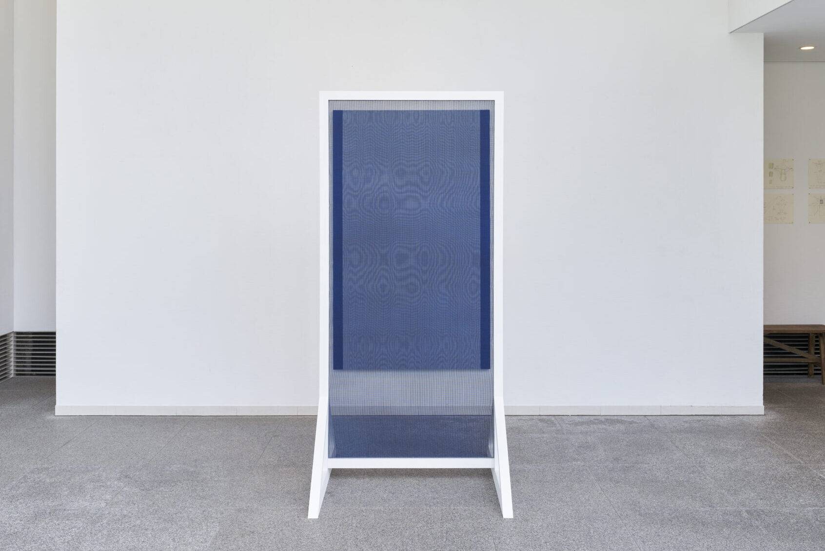 In her previous work Mizukage – Double Reflection (2/2), Kawamoto proposed a new approach by expressing the fluctuating glare on the water’s surface through moiré patterns—interference stripes generated by layering the weave structures of fabric. Continuing her investigation into this phenomenon, she noticed that under certain conditions these patterns exhibit a peculiar behavior: they appear when viewed from afar, yet disappear as the viewer draws closer.